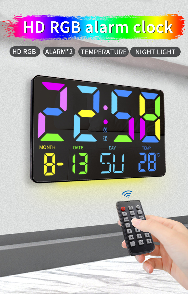 AGSIVO Large RGB Rainbow Digital Wall Clock Alarm Clock Large LED Display with Snooze / Remote Control / Automatic Brightness / Indoor Temperature / Date / Week / 12/24H For Home Office Classroom