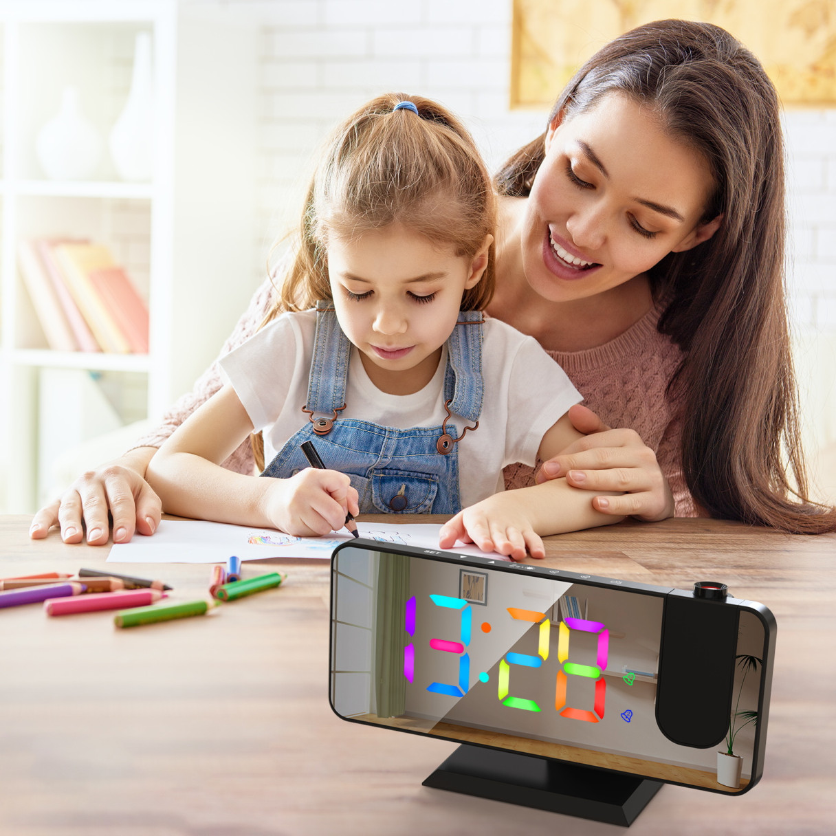 AGSIVO LED RGB Digital Projection Alarm Clock with 180° Rotatable Projector / 11 Colors / Mirror Surface / Snooze / 6-Level Brightness Dimmer / Clear LED Display / USB Charger For Bedroom Living Room