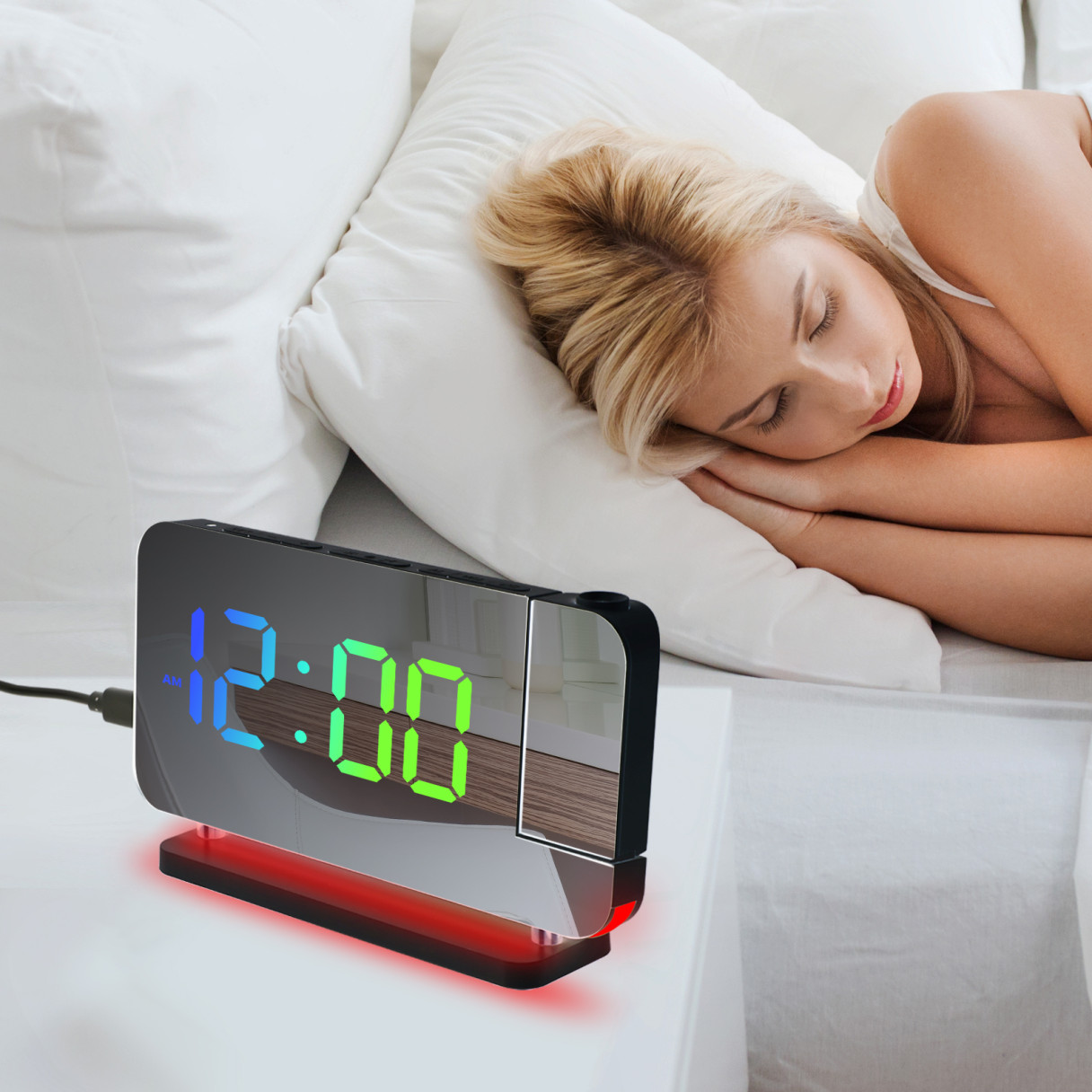 reveil trés joli - grand choix de couleurs d'affichage - baisse automatique de la luminosité - 1 seule alarme - je n'utilise pas la projection - au final trés bien - pas d'alim fournie, seul le cordon USB C.