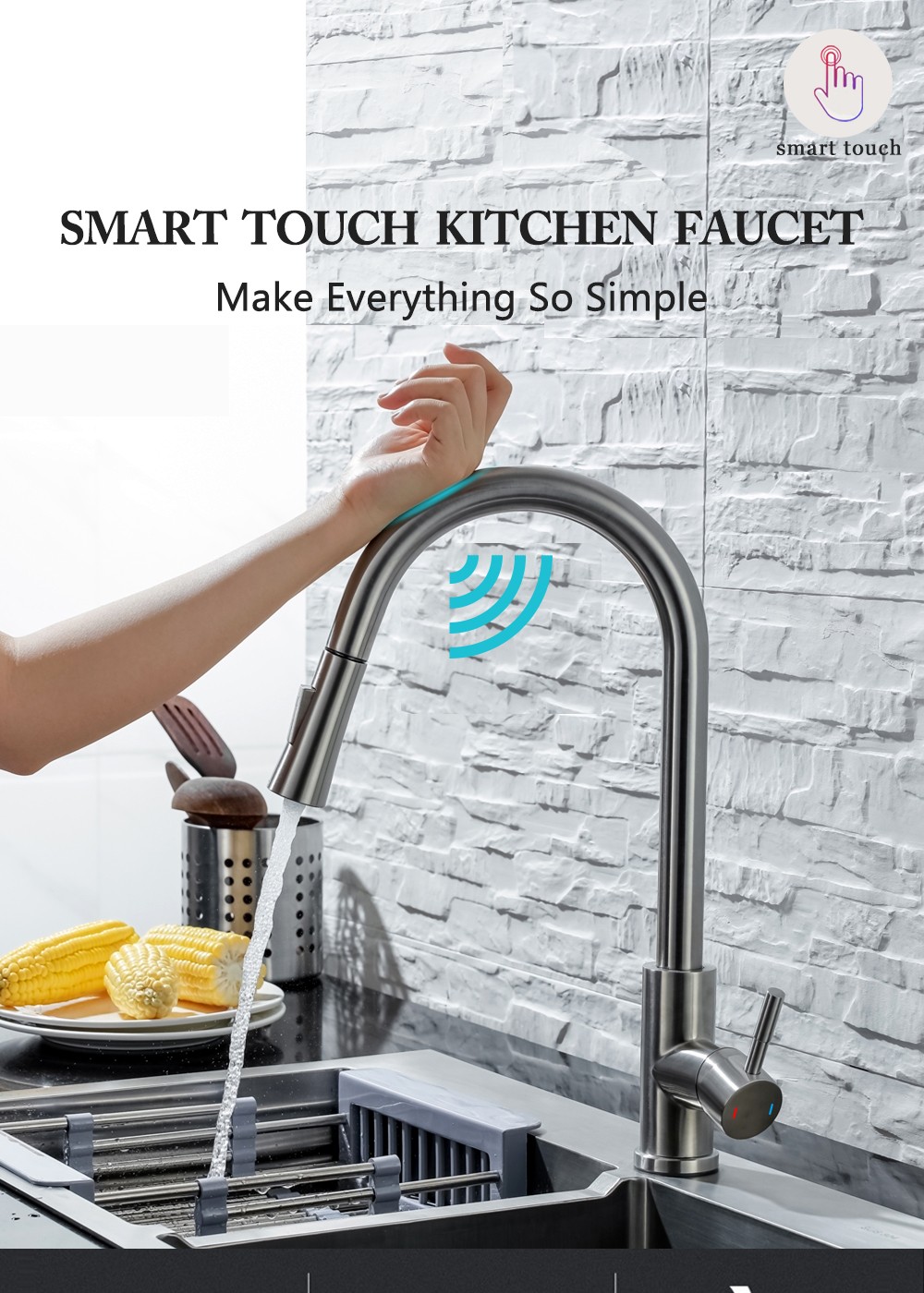 AGSIVO Smart Touch Kitchen Sink Faucet 360 ° Rotation with Pull Down Sprayer Motion Sensor Cold Hot Mixed Tap SUS 304 Stainless Steel Brushed Nickel