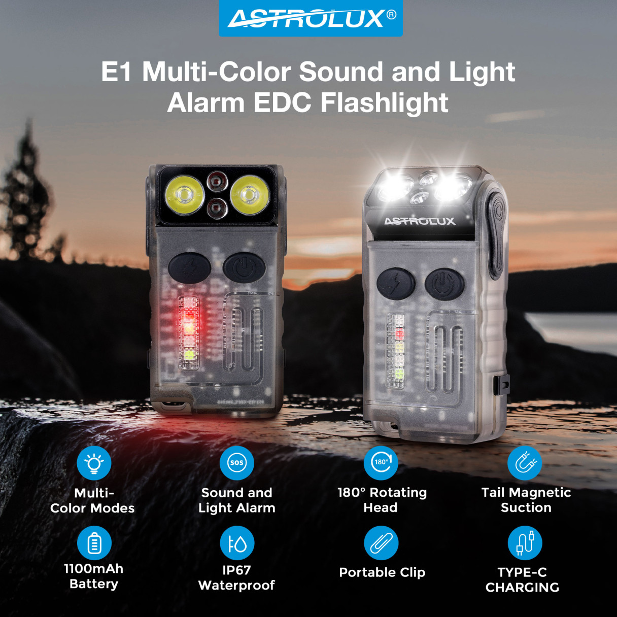Astrolux® E1 1000 Lumens EDC Keychain Flashlight with Sound Alarm RGB Light 1100mAh 180° Rotation Mini Tactical LED Floodlight Type-C USB Fast Chargring IP67 Powerful Work Lamp for Outdoor Protection, Walking, Running, Hiking and Camping