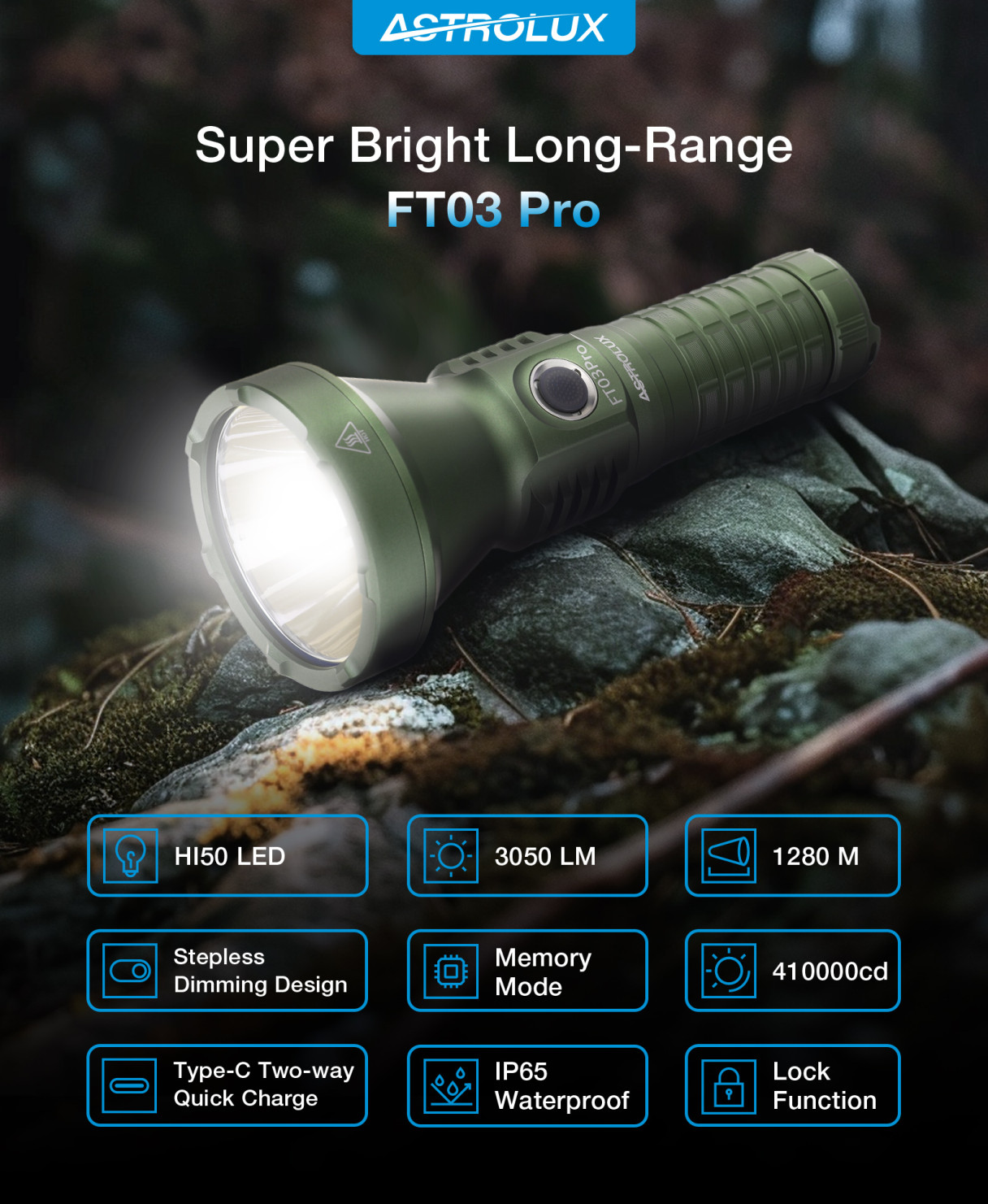 Astrolux® FT03 Pro HI50 LED 3050LM High Lumen Flashlight 1280M Thrower USB-C Rechargeable Power by 5000mAh 26650 Battery High Performance Stepless Dimming Powerful LED Torch
