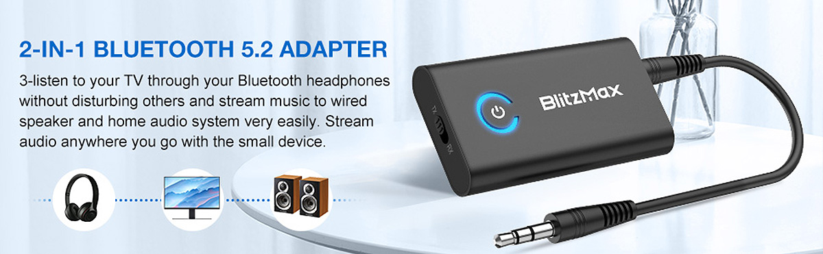 BlitzMax BT05 Transmitter Receiver bluetooth V5.2 Apt Adaptive Low Latency HiFi Sound Dual Link Pairing 2 in 1 Audio Mini Portable Adapter for PC TV Wired Speaker
