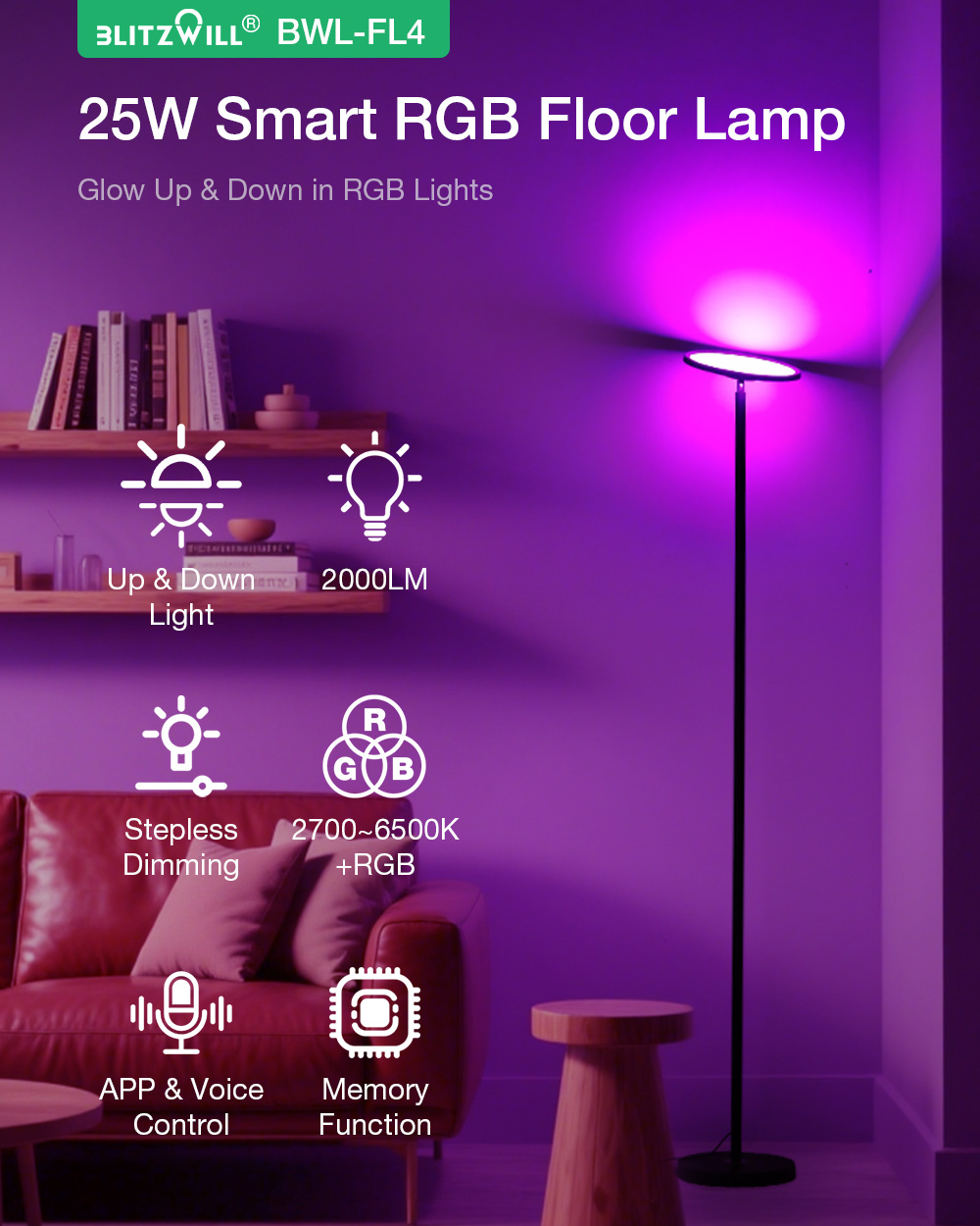 BlitzWill® BWL-FL4 25W Smart RGB Floor Lamp With Up & Down Ambient Light 2000LM 16M Colors Stepless Dimming APP & Voice Control
