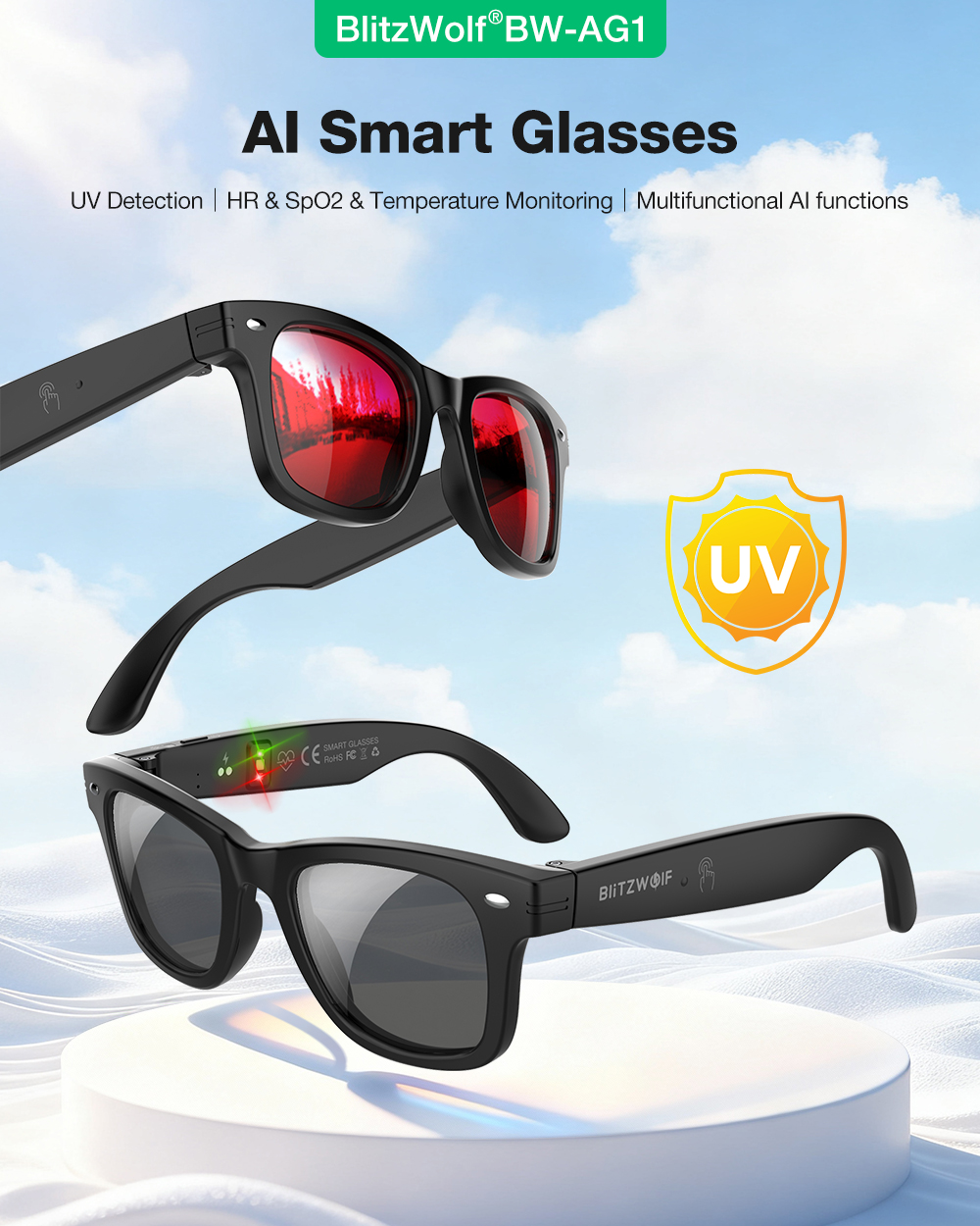 BlitzWolf BW-AG1 AI Smart Glasses Heart Rate Blood Oxygen Monitoring UV Detection 100+ Languages AI Translation HiFi Audio IP66 Waterproof Fitness Tracking Smart Audio Glasses