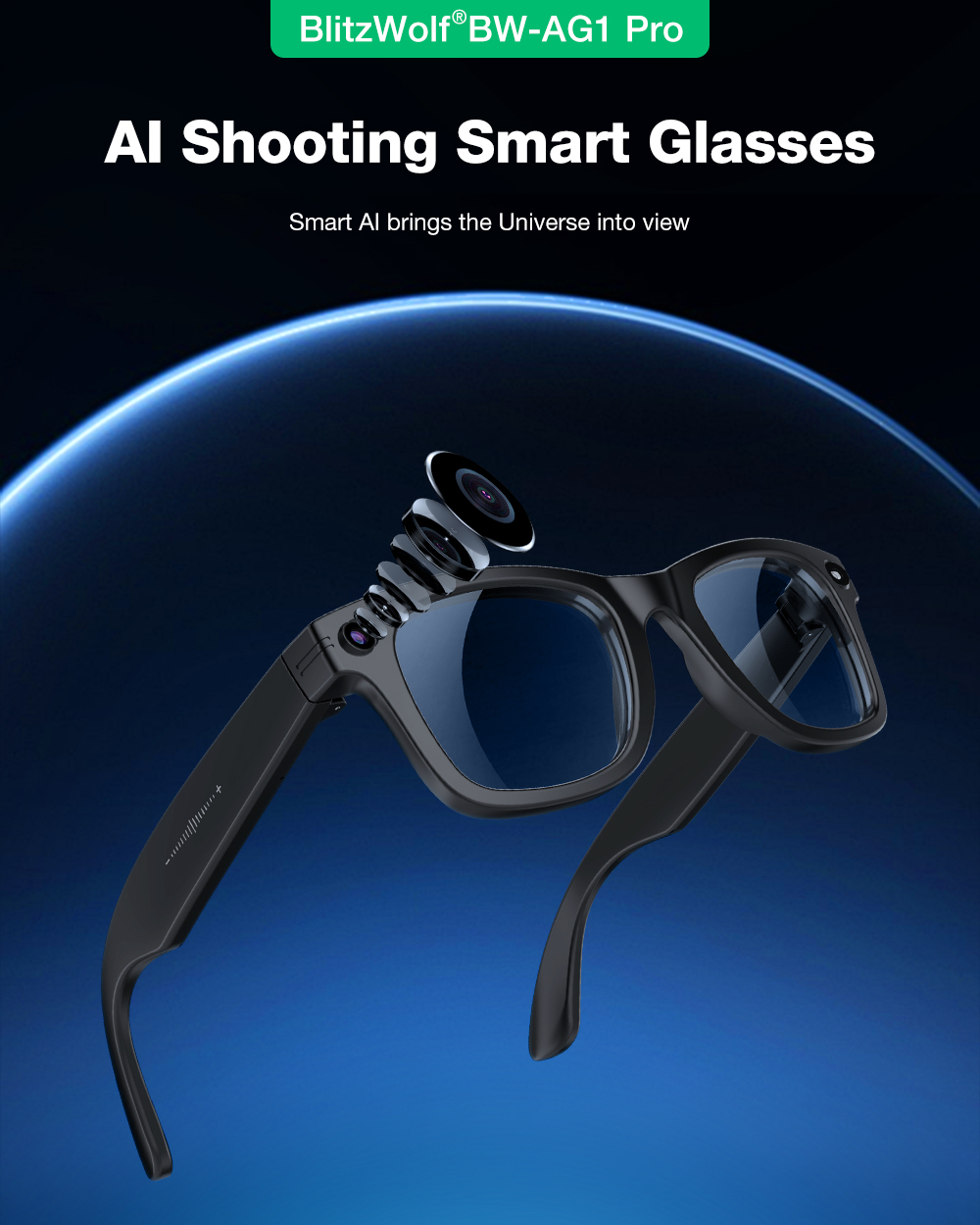 BlitzWolf BW-AG1 Pro AI Smart Glasses with HD Camera 8MP 32MP Interpolated WiFi bluetooth Call 3D Stereo Surround Sound Dual Noise Cancelling 35g IP65 Waterproof Smart Audio Glasses