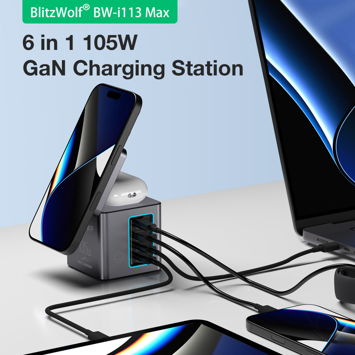 [GaN Tech] Blitzwolf BW-i113 105W 6-in-1 Desktop Charging Station with Wireless Charger PD QC Fast Charging with LED Light EU Plug for iPhone 16 16 Pro 15 14 13 Pro Max for iPad Pro for Macbook Pro for Airpods for Apple Watch