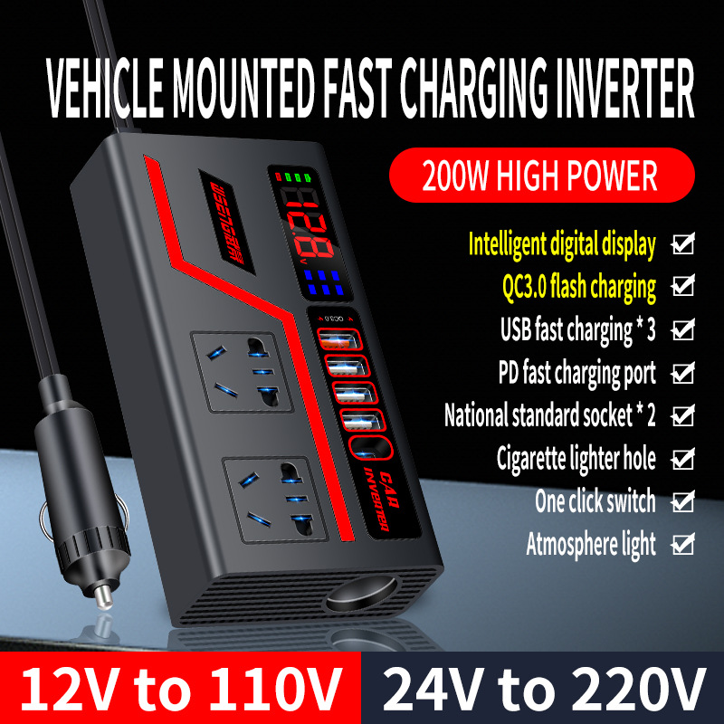 Car Inverter 12V to 110V 24V to 220V Multi-functional 200W Car Truck Converter Intelligent Digital Display Car Charging Socket