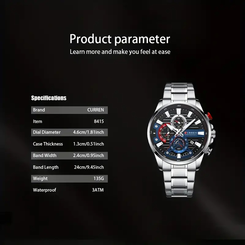 CURREN Chronograph Men's Business Sports Quartz Watch Casual Fashion Analog Calendar Wrist Watch Date Watch