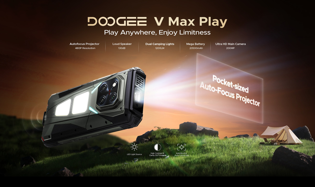 DOOGEE V Max Play 5G AI VIP Edition Built-in Projector 20500mAh 36GB 512GB 200MP Triple Camera Night Vision 6.78 inch 120Hz Loud Speaker Dual Camping Lights Android 15 Dimensity 7300 NFC IP68 IP69K Waterproof Rugged Smartphone