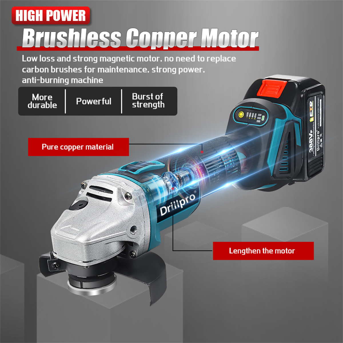 [EU Direct]Drillpro Cordless Brushless Angle Grinder 18V 800W High Power Output with Overload Resistance Compact Tool for Efficient Outdoor Operations Comes in Multiple Packages with Lithium Battery and EU Plug