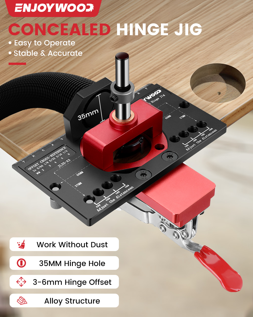ENJOYWOOD Concealed Hinge Jig with Quick Clip and Dust Vacuum Adapter Concealed Door Hinge Jig 35mm Cabinet Hinge Jig Hinge Hole Drilling Jig for Woodworking Door Cabinet Hinges Mounting Tool
