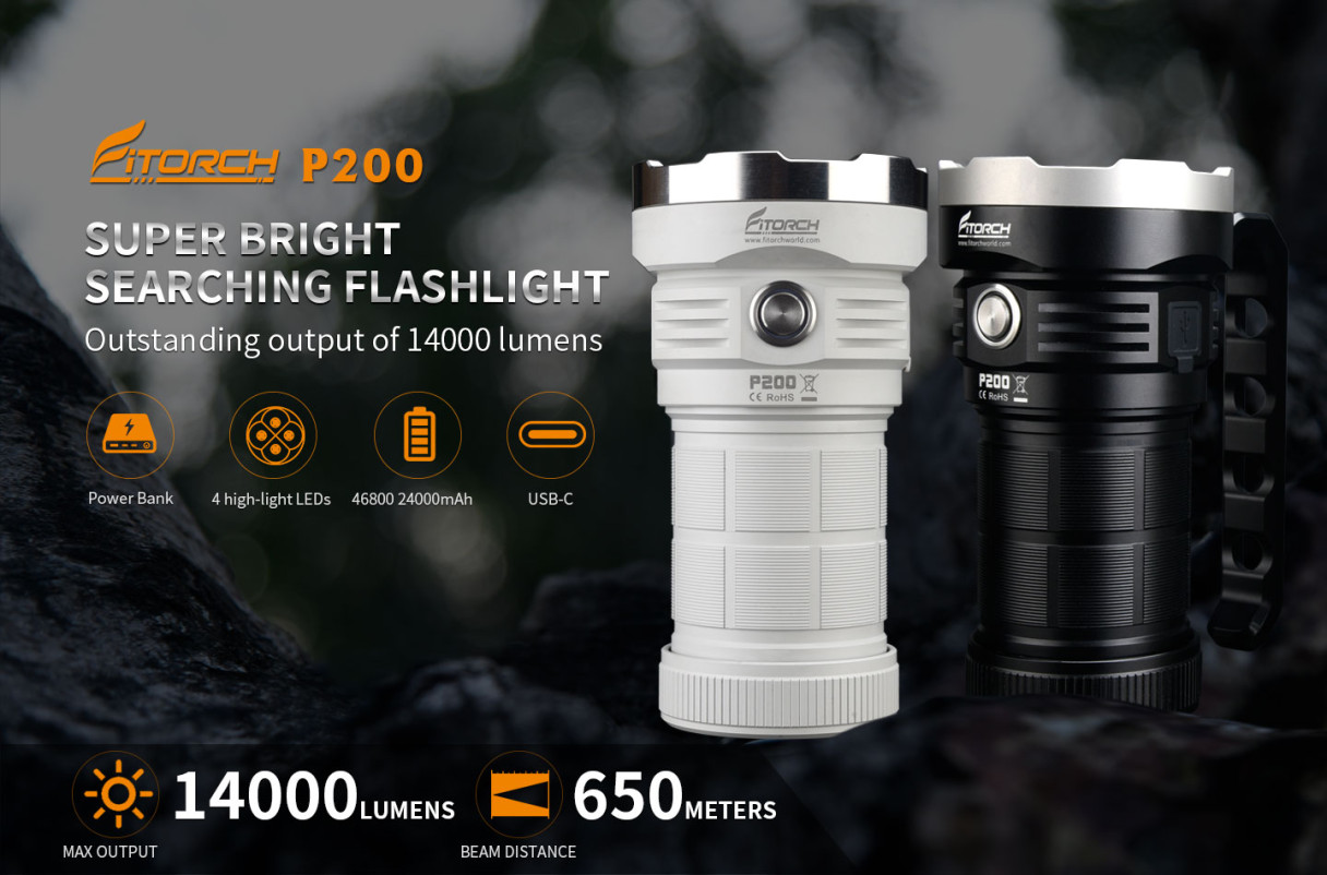 Fitorch P200 Rechargeable Searchlight 14000 Lumens USB Type-C Charging 24,000mah High Capacity Battery/Power Bank for Camping Search Rescue or Exploration
