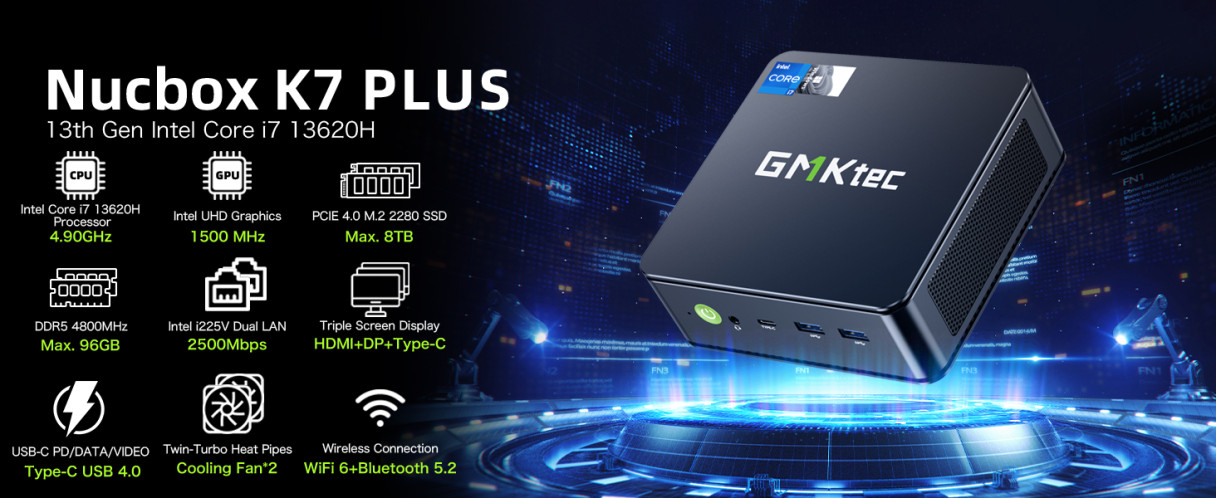 GMKtec K7 PLUS Mini PC 13th Gen Intel i7-13620H 10 Cores 16 Threads 16GB 512GB/32GB 1TB SSD WIFI 6 BT5.2 Windows 11 Pro Triple Screen Output Mini Gaming Computer Desktop PC