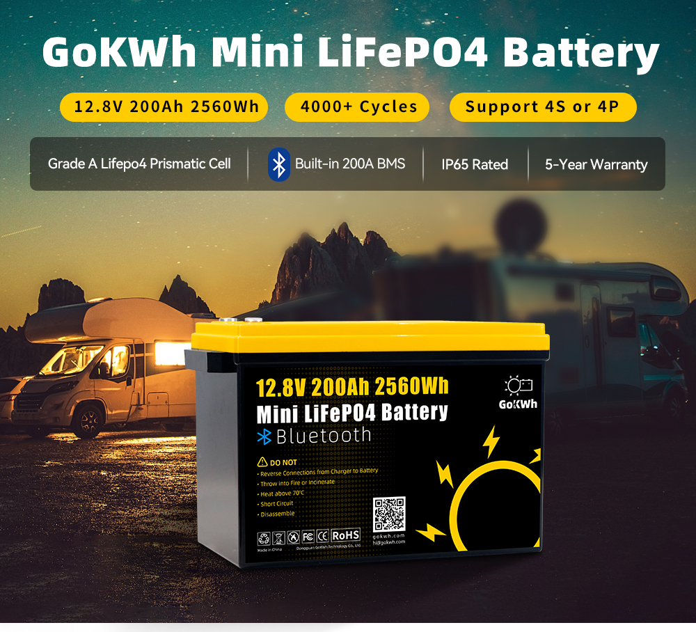 Gokwh 12V 200Ah Mini Bluetooth LiFePO4 Battery Built-in Bluetooth BMS 2560Wh LiFePO4(LFP) IP65 Protection