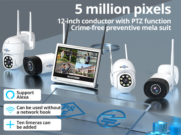 Hiseeu 4HC25 5MP 8CH Wireless CCTV Surveillance Camera System PTZ WiFi Camera with 12-inch Monitor Color Night Vision Two-way Audio Security Cameras Eseecloud APP Support Alexa