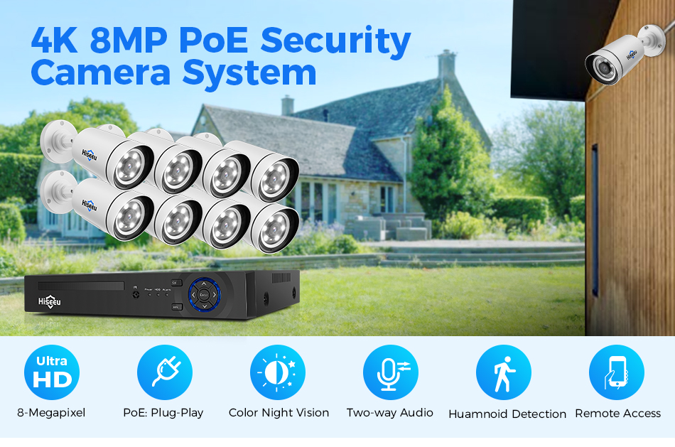 Hiseeu 4K UHD 4CH 8MP PoE Security Camera Kit Color Night Vision Two-way Audio Humanoid Detection Remote APP Viewing Outdoors IP Monitoring Cameras Kit
