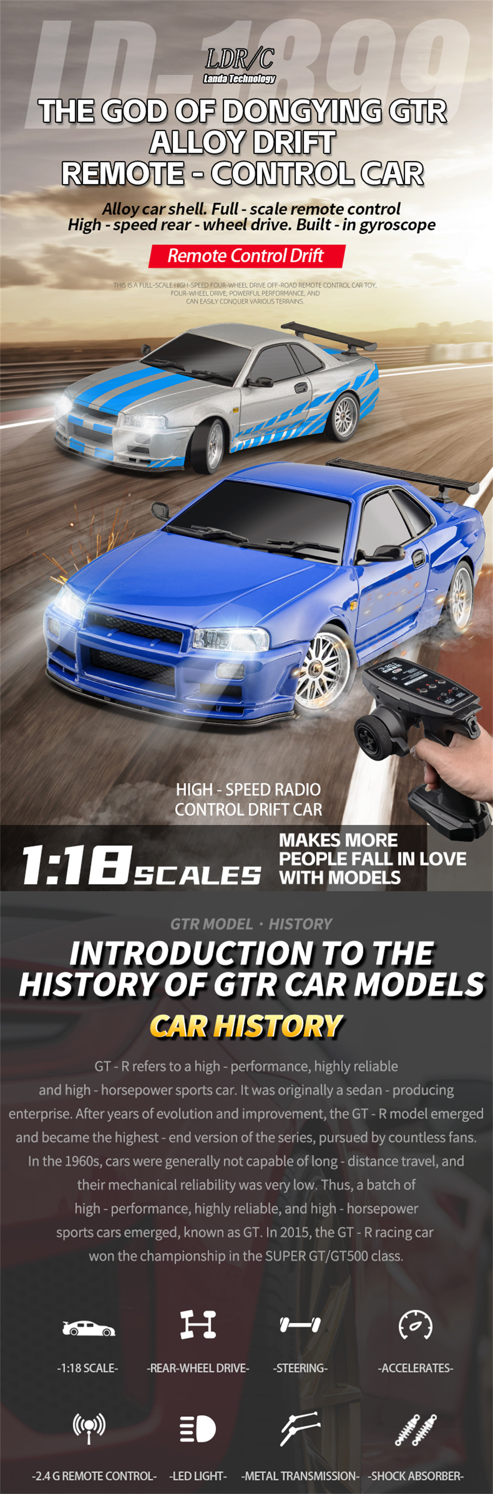 LDRC 1899/A99 RTR 1/18 2.4G RWD RC Car Drift GTR R34 Optional Gyro LED Light On-Road Full Proportional Alloy Body Shell Racing Vehicles Models Toys