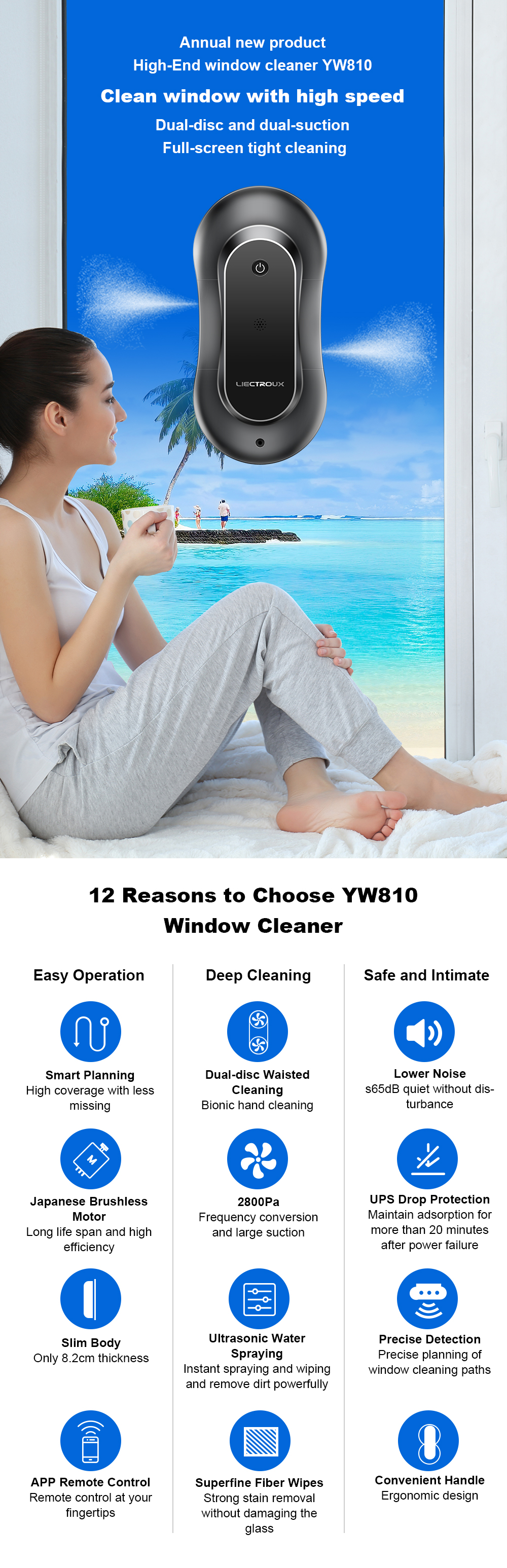 [EU Direct] Liectroux YW810 Robot Window Cleaner, 2-Way Water Spray, Robot Vacuum Cleaner for Windows, Home Electric Glass Washer & Wiper, Dry & Wet Mopping, AI Route, Brushless Motor,APP & Remote Control,Quadruple Security Protection