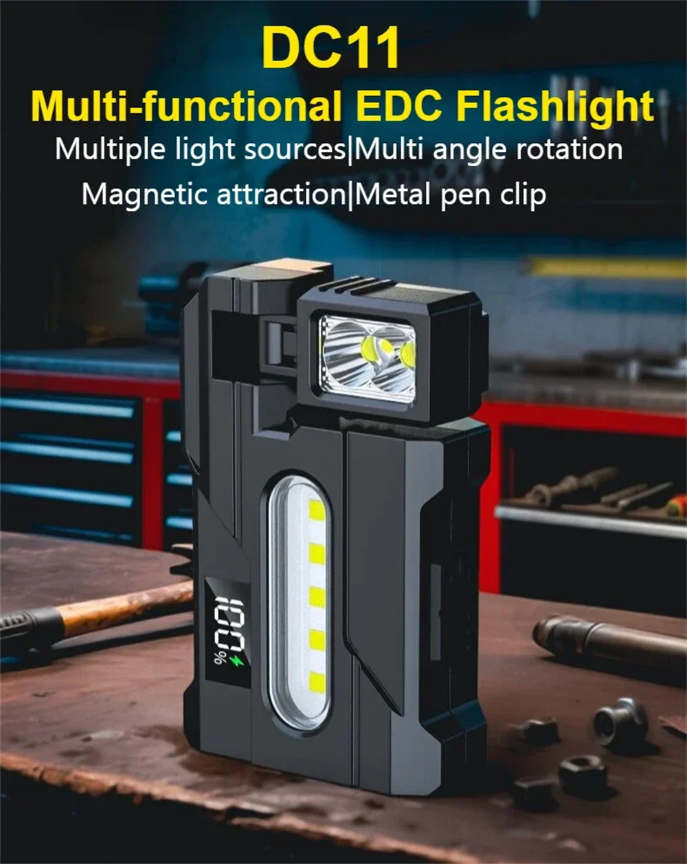 Multipurpose Dual Light Source LED Keychain Flashlight LCD Display Rotatable Pocket Work Light with Metal Clip EDC Torch for Outdoor Camping Hiking Emergency