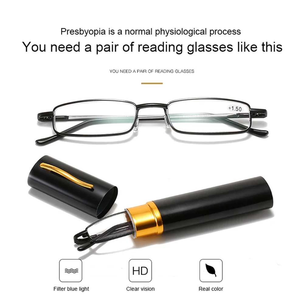Portable Mini Lightweight Reading Glasses with Pen Tube Case Anti-blue Light Presbyopic Glasses Metal Case Women Men Eyeglasses +1.5-+3.5