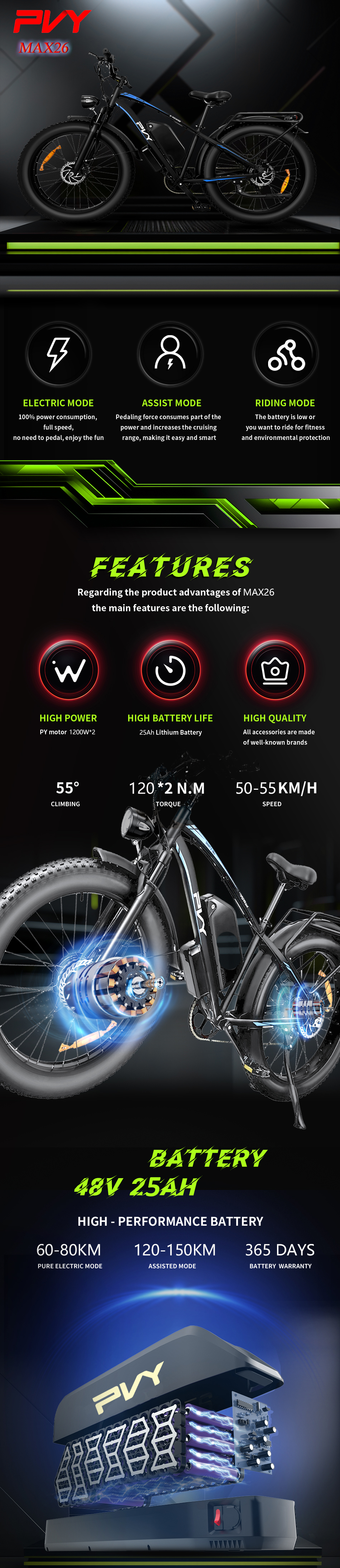 [EU DIRECT] PVY MAX26 Electric Bike 48V 25Ah Battery 1200W*2 Dual Motors 26inches Tires 80-150KM Max Mileage 150KG Max Load Fat Tire Snow Tire Electric Bicycle PVY MAX 26