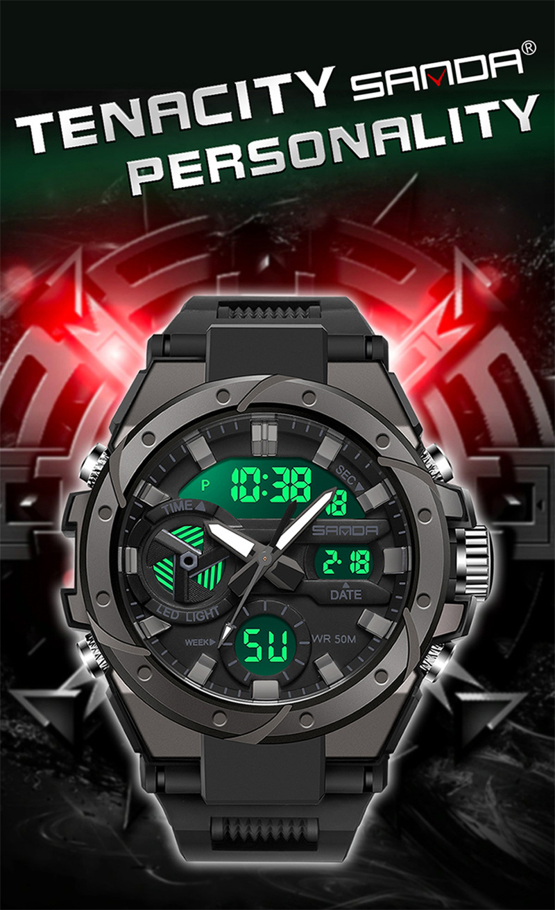 SANDA Men Quartz Watch Waterproof Sport Wristwatches Multifunctional Outdoor Luminous Electronic Watch - Dual Display, Calendar, Alarm Clock, Stopwatch