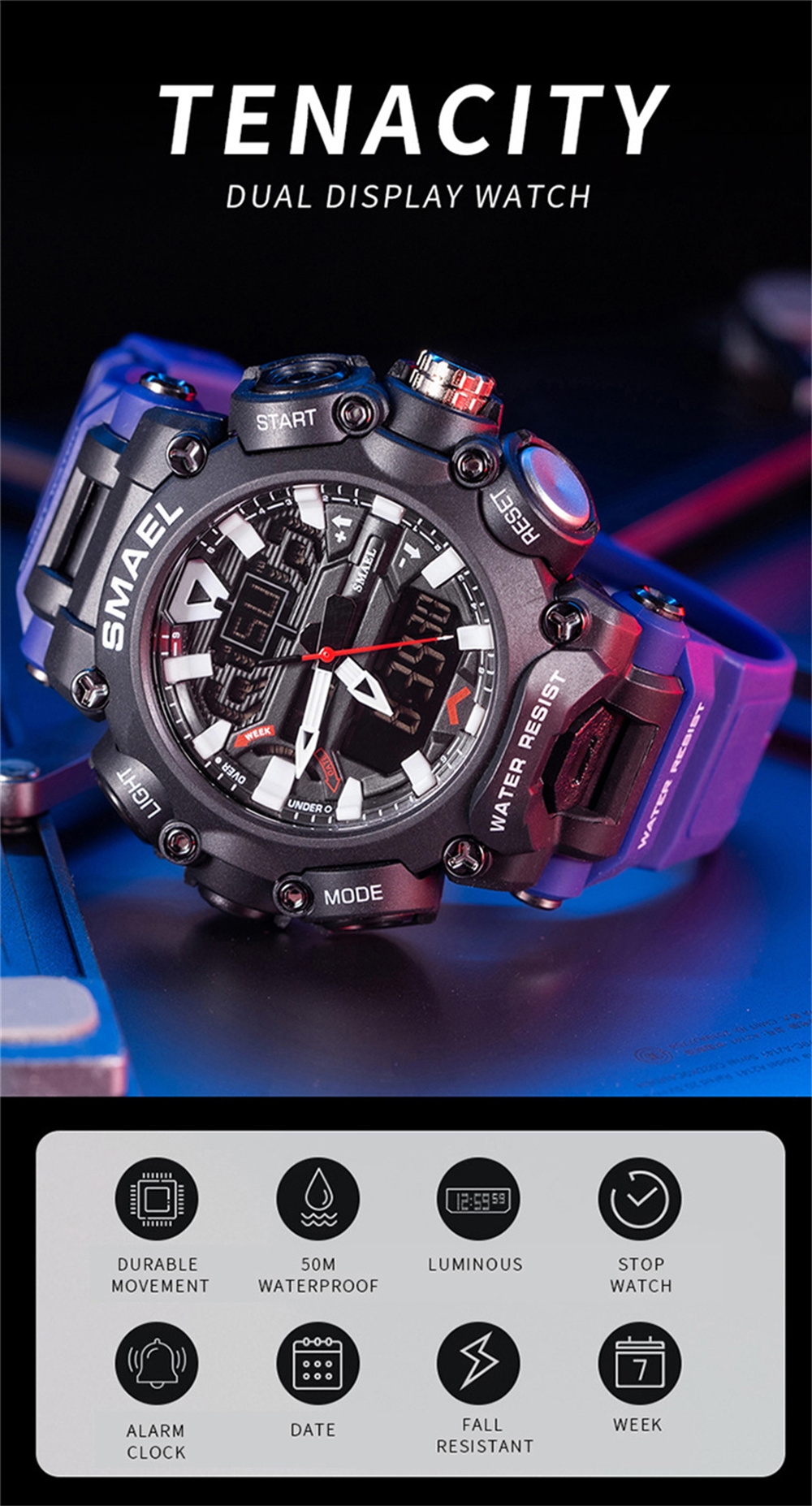 SMAEL Men Sport Digital Dual Display Watch Multi-function LED Luminous Waterproof Date Week Alarm Wristwatch