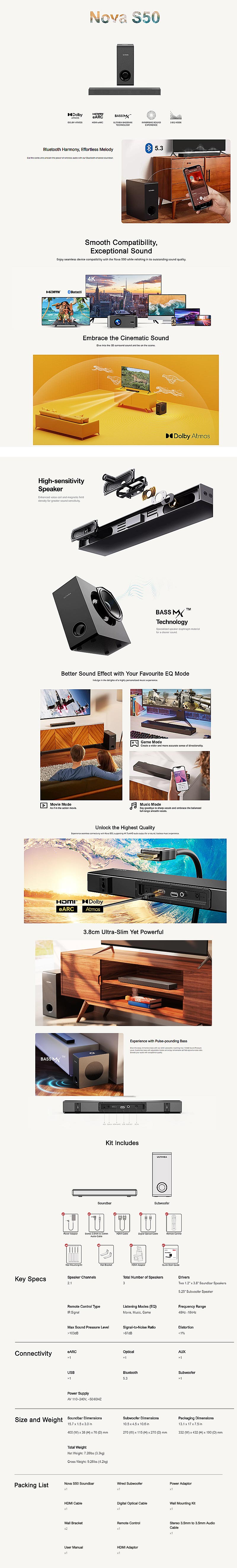 Ultimea Nova S50 BT5.3 Soundbar 2.1 Channels Subwoofer 5.25'' Speaker Dolby Atmos HD eARC Bass 3D Surround 3 EQ Modes Wired Desktop Speaker