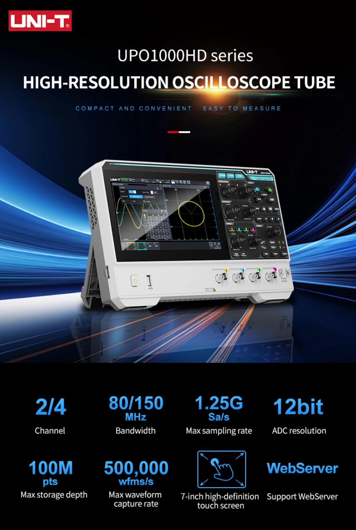 UNI-T UPO1152HD UPO1154HD Oscilloscope 2/4 Channels 150MHz Bandwidth 12-bit ADC 1.25GSa/s Sampling Rate Large Storage Depth High-Definition Touch Screen