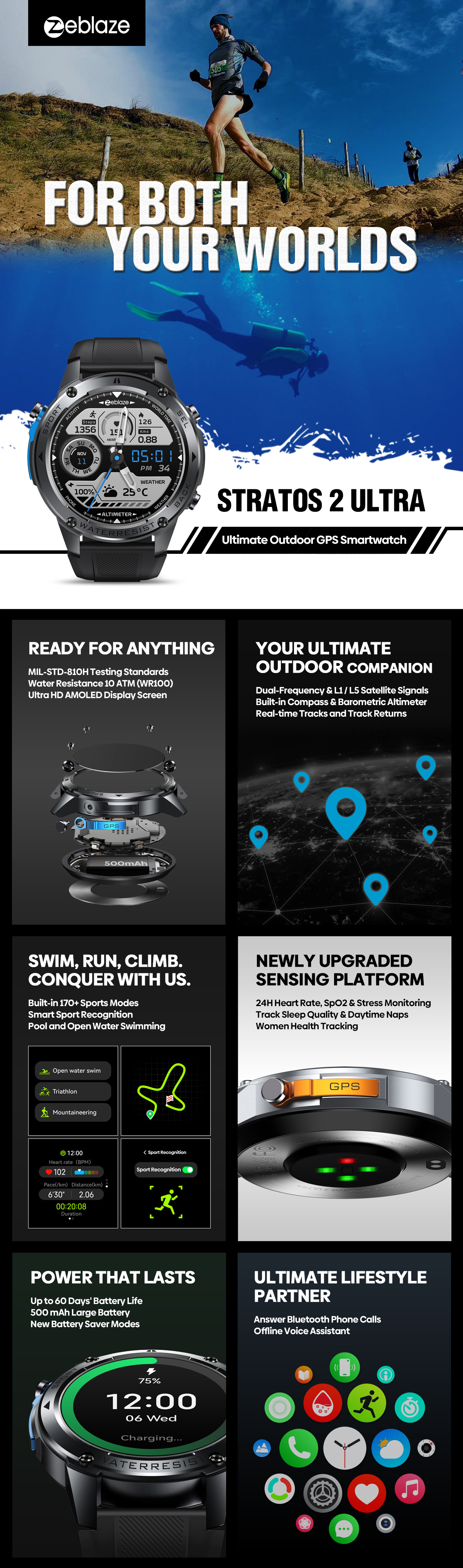 [World Premiere]Zeblaze Stratos 2 Ultra 1.43 HD AMOLED GPS 10 ATM Waterproof Barometric Altimeter Compass 60 days Battery Life GPS Dual-band GNSS 6 SatellitePositioning System Health Management Ultimate Outdoor Smart Watch
